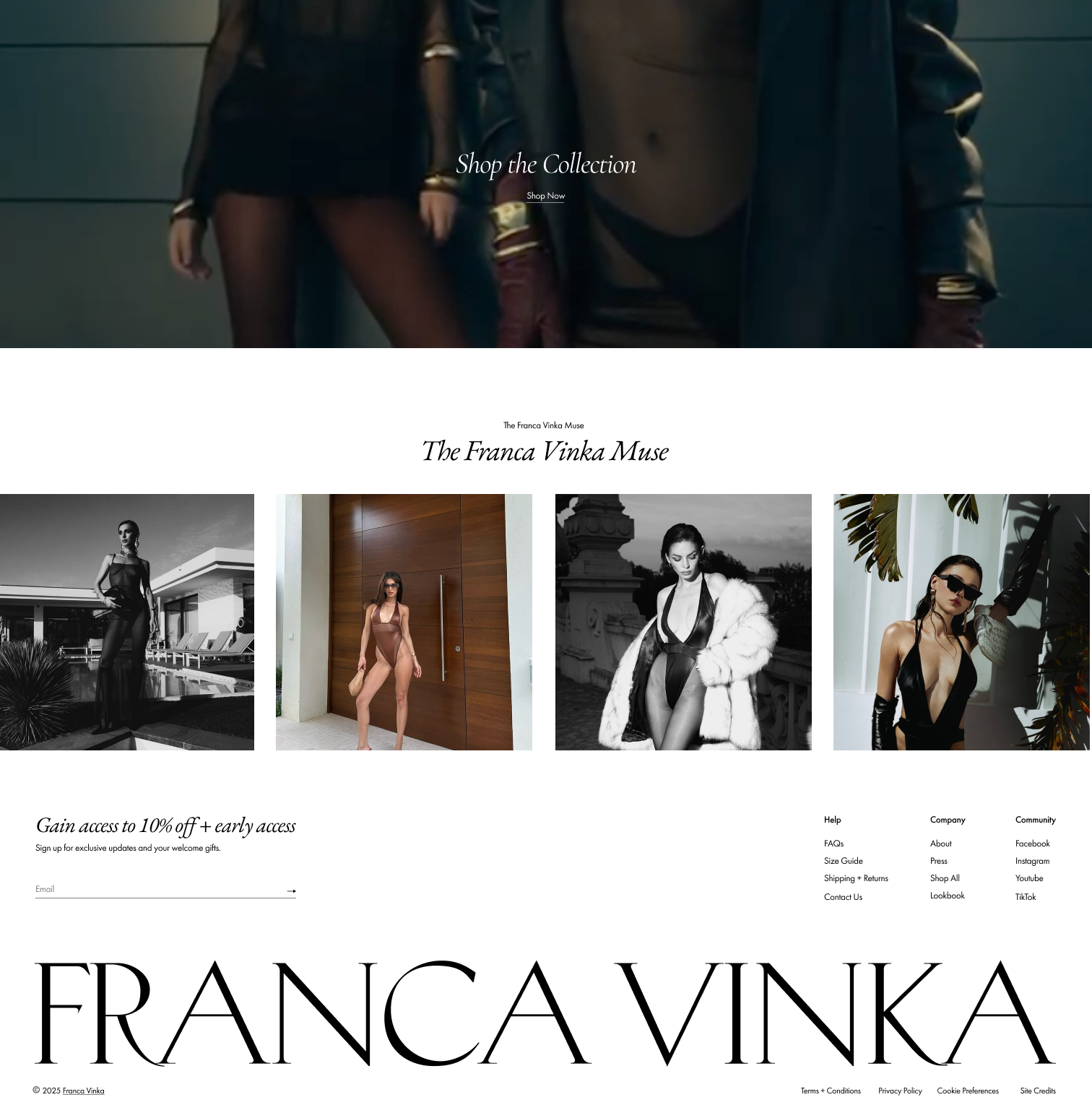 Franca Vinka is a fashion-led luxury swimwear and resortwear brand rooted in editorial storytelling. Our role was to redesign the Shopify experience in a way that lifted conversion and visual identity - preserving the brand’s luxury feel while creating a more intentional user journey.