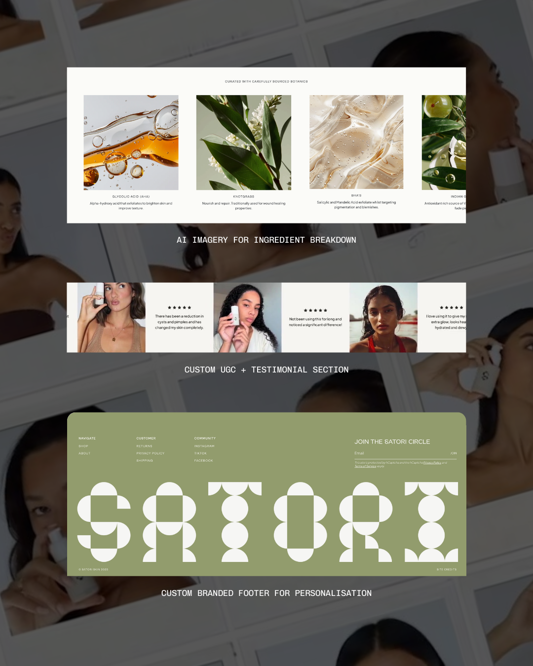 The product page was restructured to prioritise persuasion - improving above-the-fold information and benefit communication. Custom UGC and testimonial sections were introduced. We created bespoke AI-generated ingredient imagery to visually communicate the educational section, and a footer transformed into a strong visual moment.